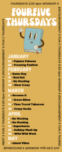 Bayside FourFive is for 4th and 5th grade students and exists to partner with parents to help youth dig deeper as they grow spiritually while building new friendships. We want to challenge youth to grow in their faith, serve Christ, and discover ways to share God’s love with others.